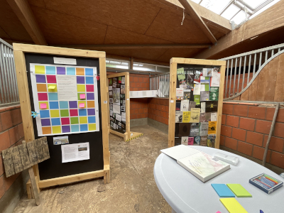 Im anschließenden Gang und drei Pferdeboxen waren verschiedene Artefakte, Bild- und Tondokumente zu sehen und zu hören, die an die vielfältigen Aktionen der Initiative Buirer für Buir und die von unterschiedlichen Akteur*innen getragenen Kampagnen zum Erhalt des Hambacher Waldes erinnern. So waren an zwei Hörstationen Berichte von Zeitzeugen zu hören und an einem Tablet Videos von z. T. künstlerisch gestalteten Protestaktionen zu sehen. An einem weiteren Tablet wurde eine umfangreiche Pressedokumentation präsentiert. Ein besonderes Exponat war das Modell des Tunnels, in den sich 2012 ein junger Mann zurückgezogen hatte und die Räumung der Waldbesetzung um fünf Tage verzögerte.